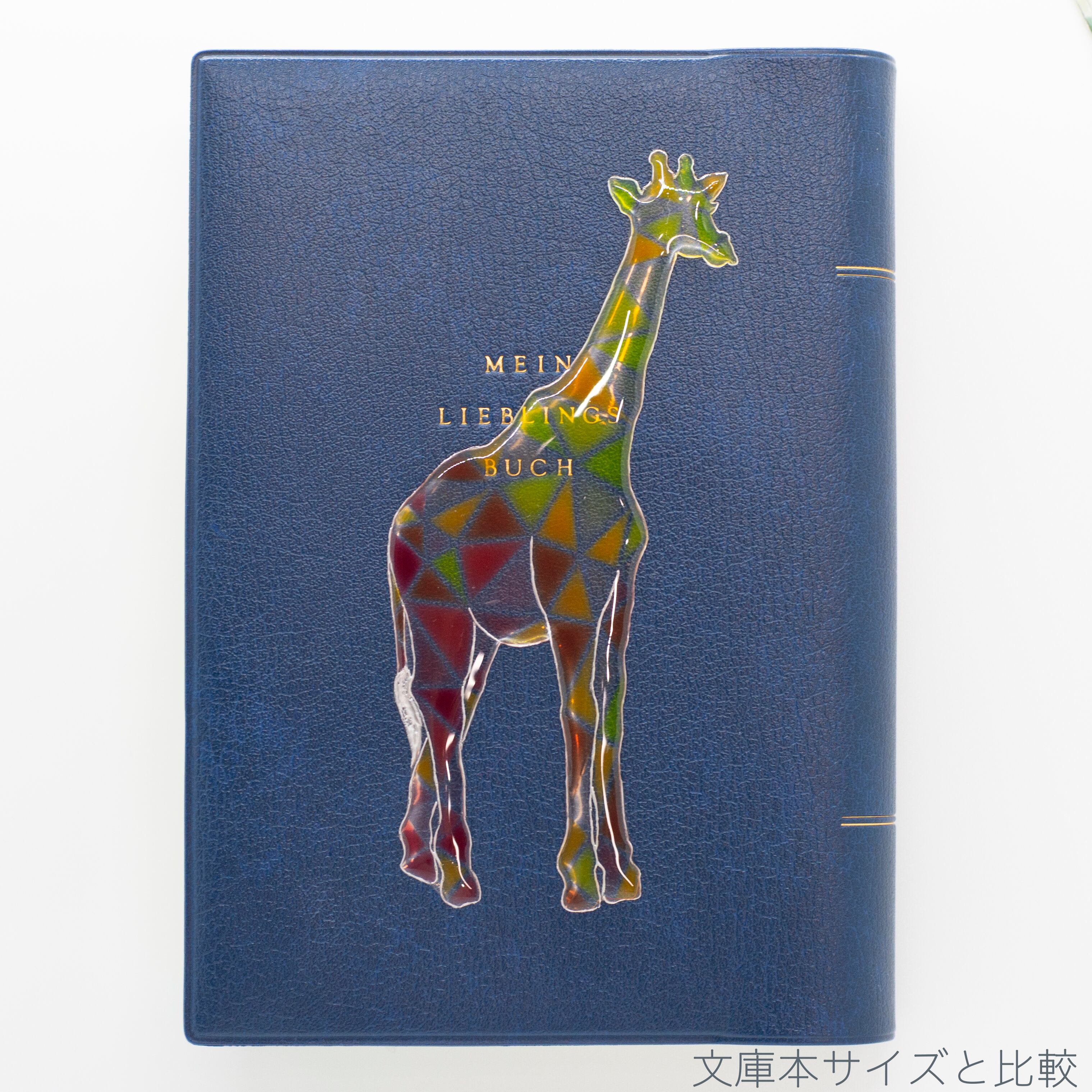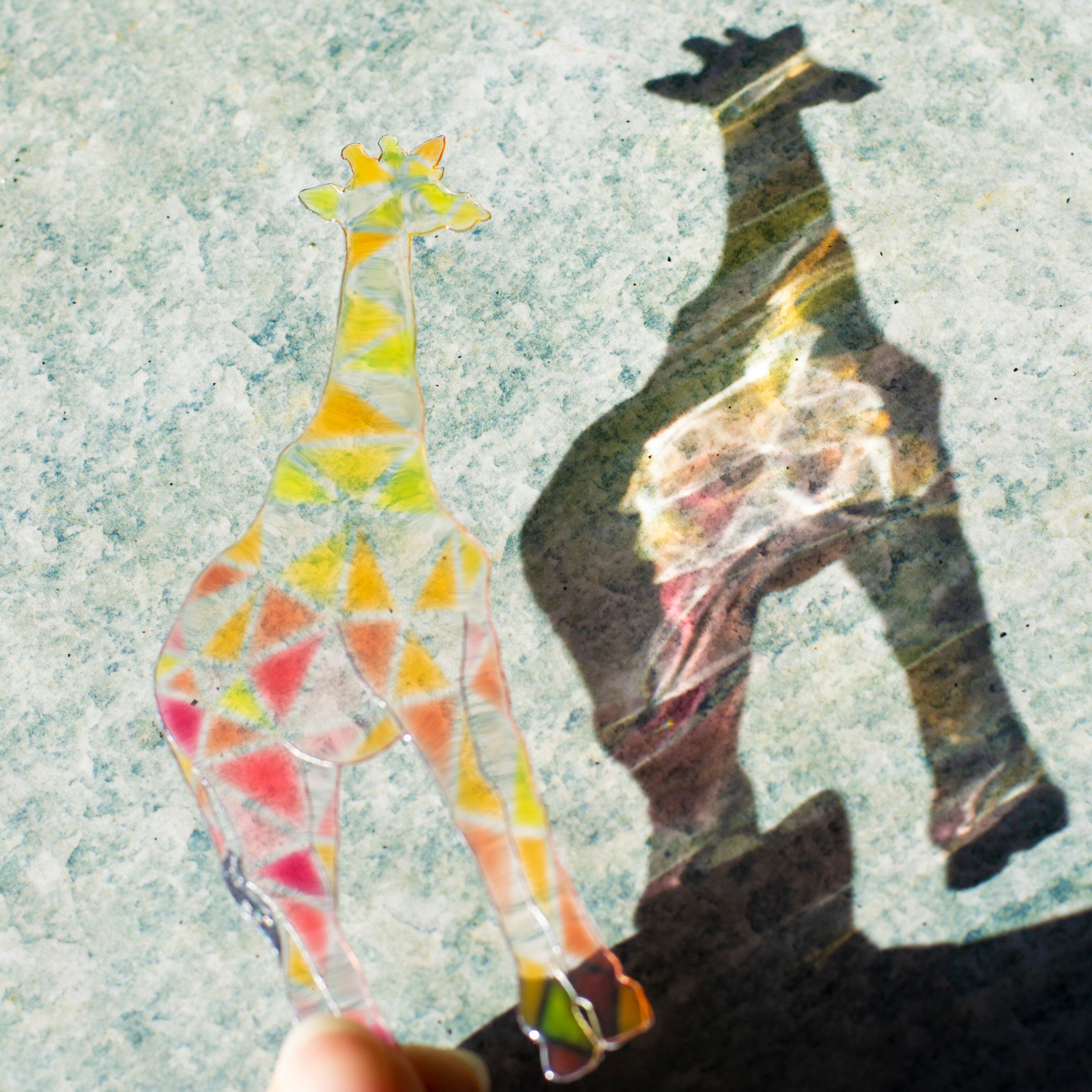 光沢のあるラインで縁取られた、ステンドグラスのような透明感のあるキリンをデザイン。