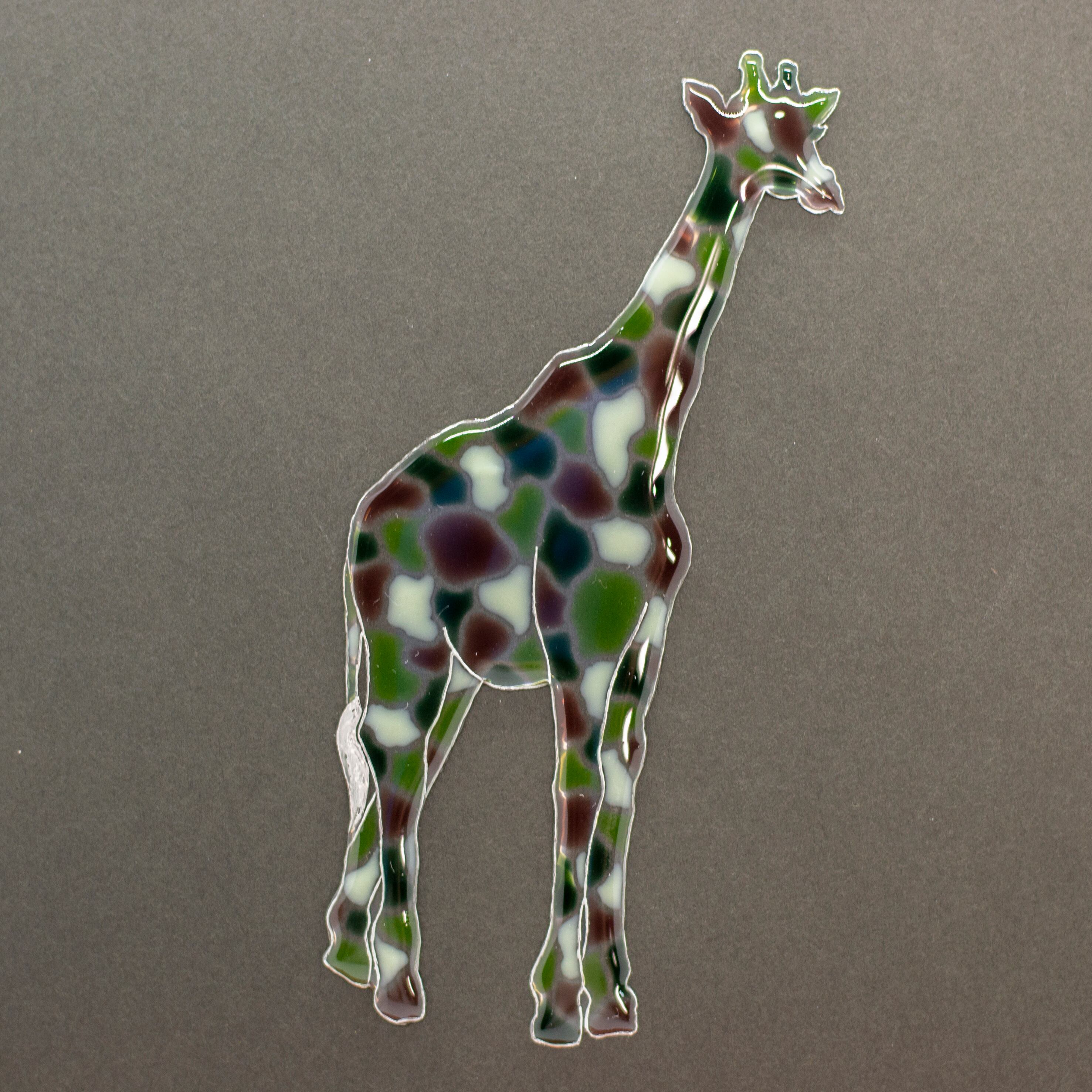 シルバーラインで縁取られた、ステンドグラスのような透明感のあるキリンをデザイン。